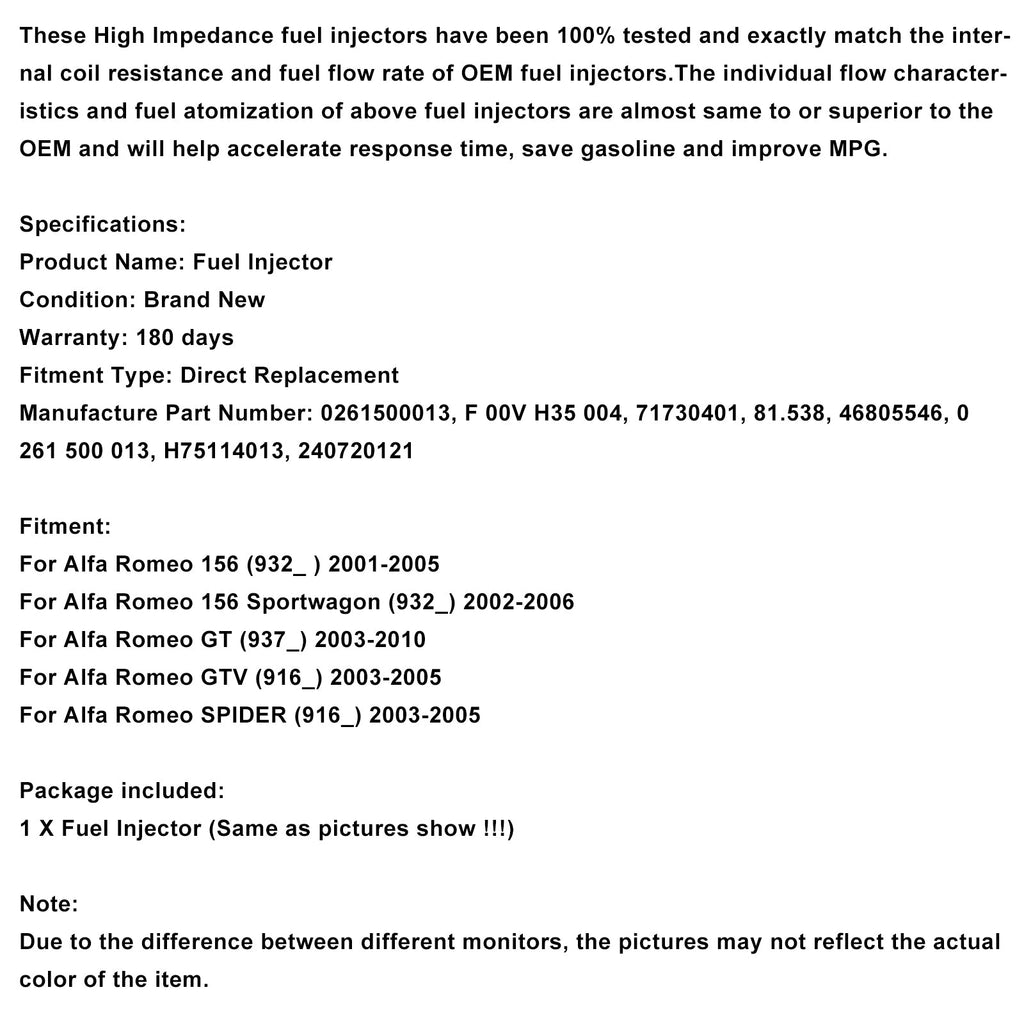 Estos inyectores de combustible de alta impedancia han sido probados al 100% y coinciden exactamente con la resistencia interna de la bobina y el flujo de combustible de los inyectores OEM. Las características de flujo y la atomización de combustible de estos inyectores son casi idénticas o mejores que las de los OEM, lo que ayudará a reducir el tiempo de respuesta, ahorrar gasolina y mejorar el consumo de combustible.