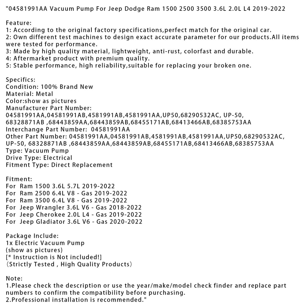 Bomba de vacío 04581991AA compatible con Jeep Dodge Ram 1500 2500 3500 3.6L 2.0L L4 2019-2022