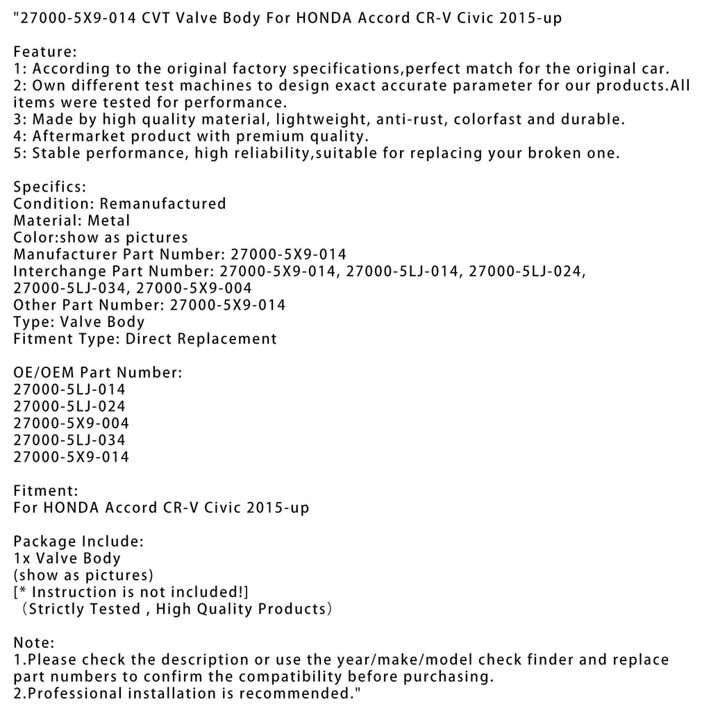 Cuerpo de válvula CVT 27000-5X9-014 para HONDA Accord CR-V Civic 2015 en adelante