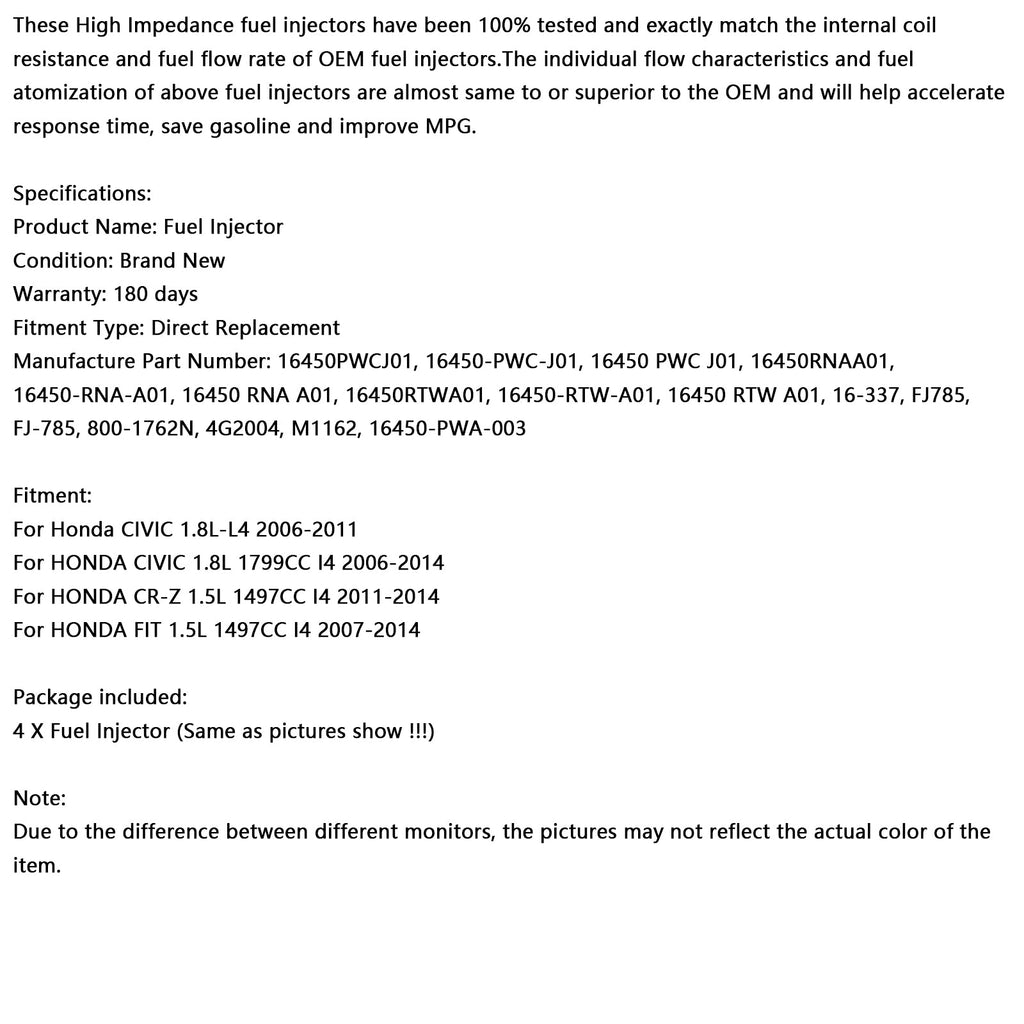 Estos inyectores de combustible de alta impedancia han sido probados al 100% y coinciden exactamente con la resistencia interna de la bobina y el flujo de combustible de los inyectores OEM. Las características de flujo y la atomización de combustible de estos inyectores son casi idénticas o mejores que las de los OEM, lo que ayudará a reducir el tiempo de respuesta, ahorrar gasolina y mejorar el consumo de combustible.
