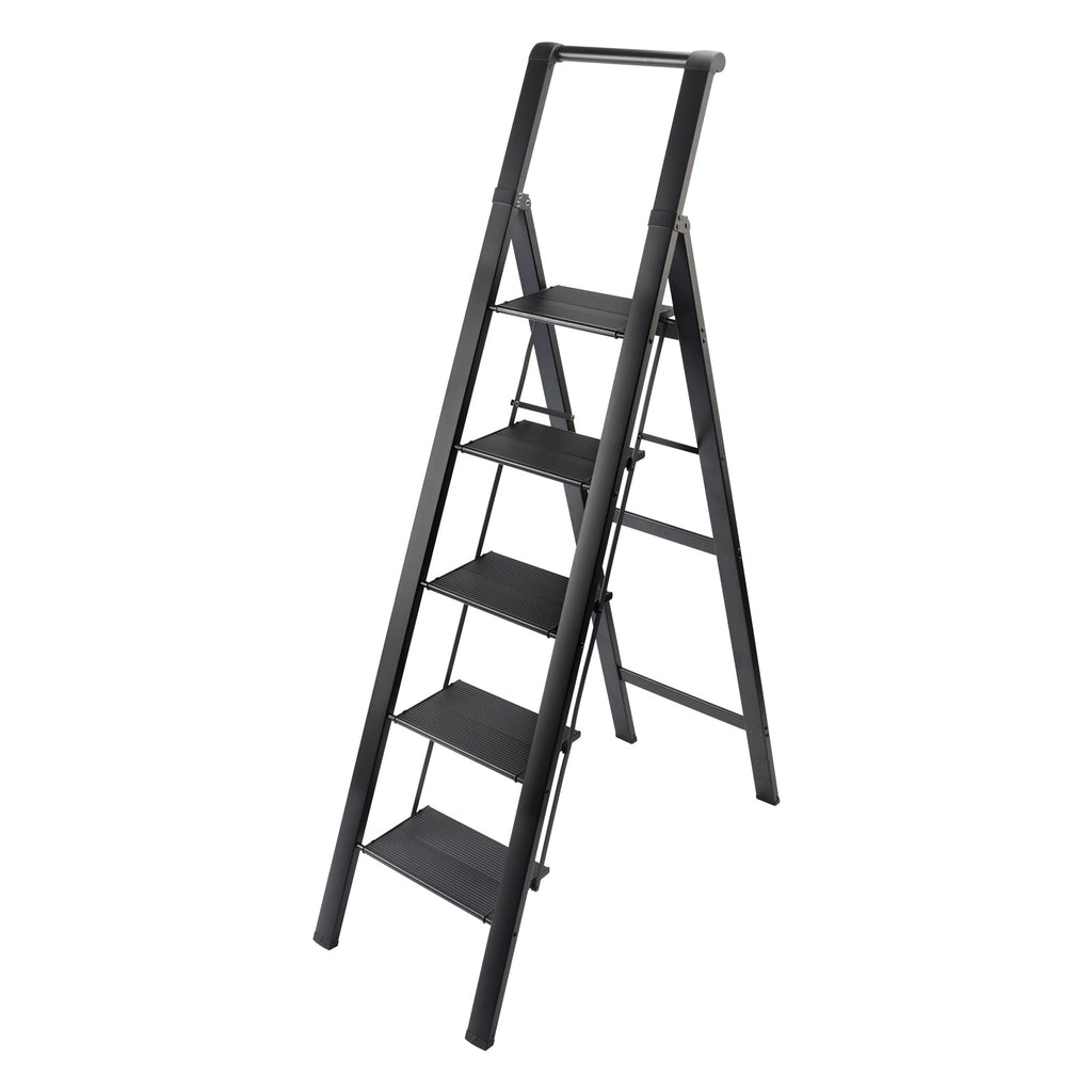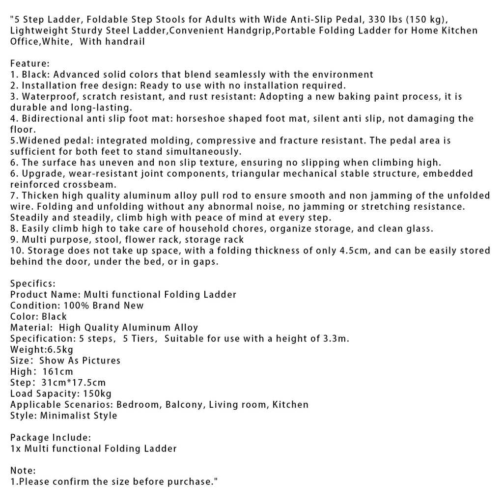 Taburete plegable de 5 escalones para adultos con pedal ancho antideslizante, 150 kg (330 lb), escalera de acero ligera y resistente, asa cómoda, escalera plegable portátil para el hogar, la cocina o la oficina, color blanco, con pasamanos.