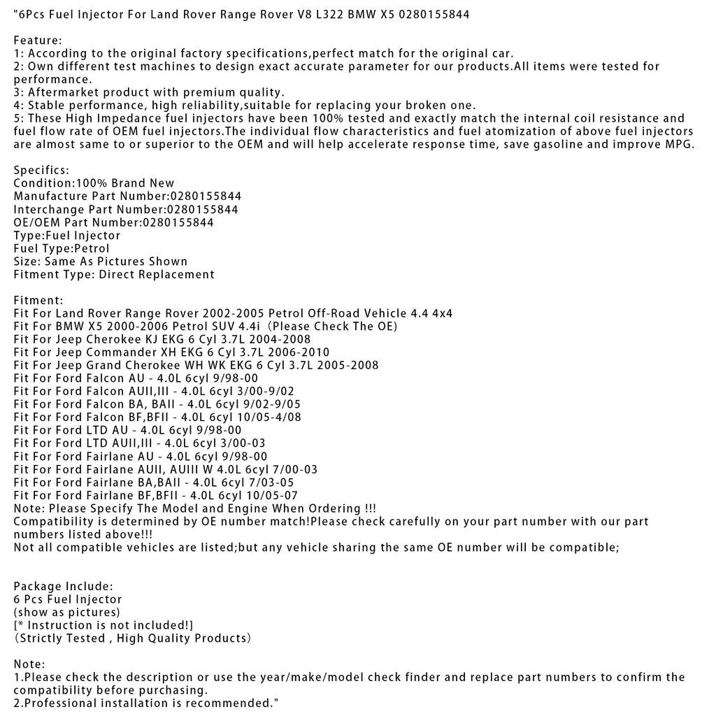 Juego de 6 inyectores de combustible para Land Rover Range Rover V8 L322 y BMW X5 (referencia 0280155844)