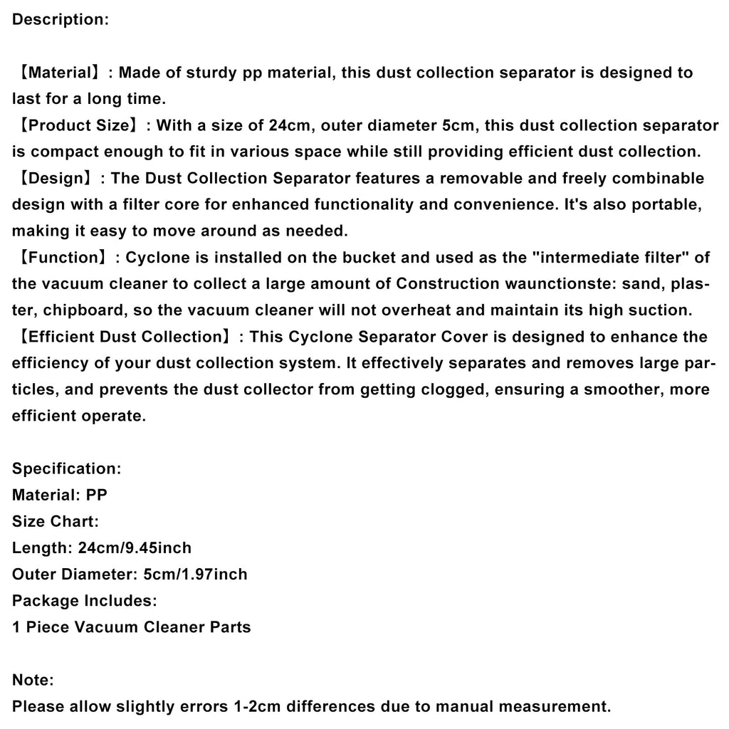 【Tamaño del producto】: Con un tamaño de 24 cm y un diámetro exterior de 5 cm, este separador colector de polvo es lo suficientemente compacto para adaptarse a varios espacios y, al mismo tiempo, proporciona una recolección de polvo eficiente.