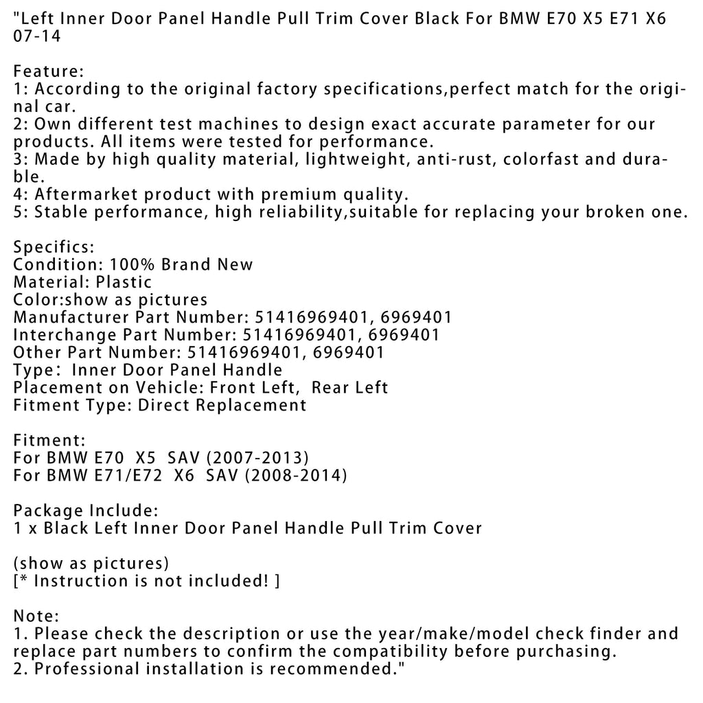 Embellecedor de manija de Panel de puerta Interior izquierdo negro para BMW E70 X5 E71 X6 07-14