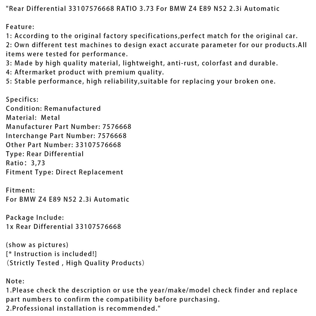 Diferencial trasero 33107576668 RATIO 3.73 para BMW Z4 E89 N52 2.3i Automático