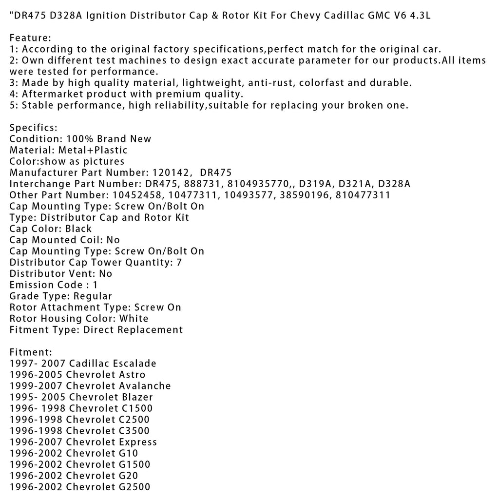 Kit de tapa y rotor de distribuidor de encendido DR475 D328A para Chevrolet, Cadillac y GMC V6 de 4,3 L