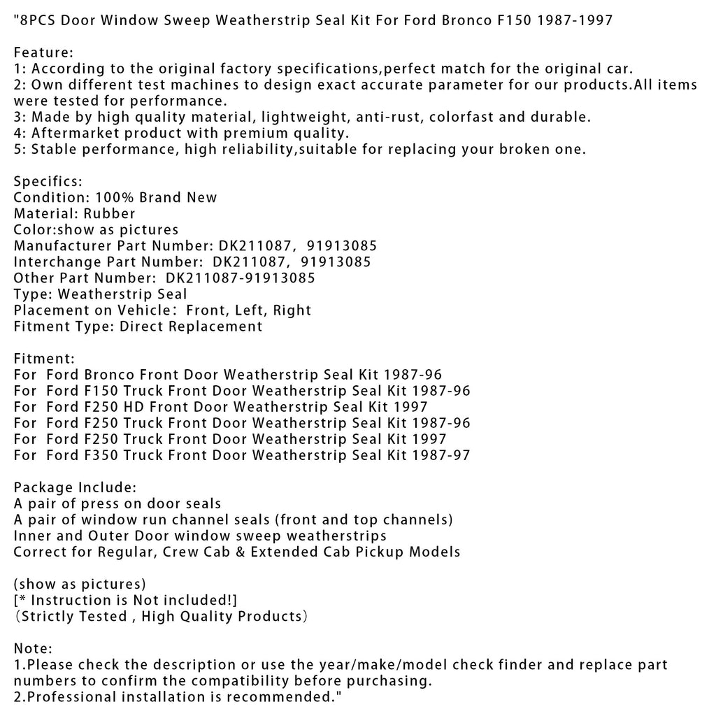 Kit de sellos para ventanas y puertas de 8 piezas, compatible con Ford Bronco F150 1987-1997