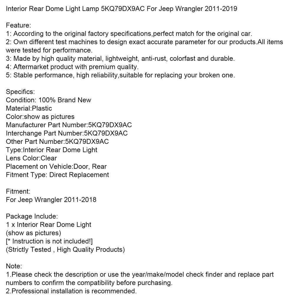 Luz de techo trasera interior 5KQ79DX9AC compatible con Jeep Wrangler 2011-2019