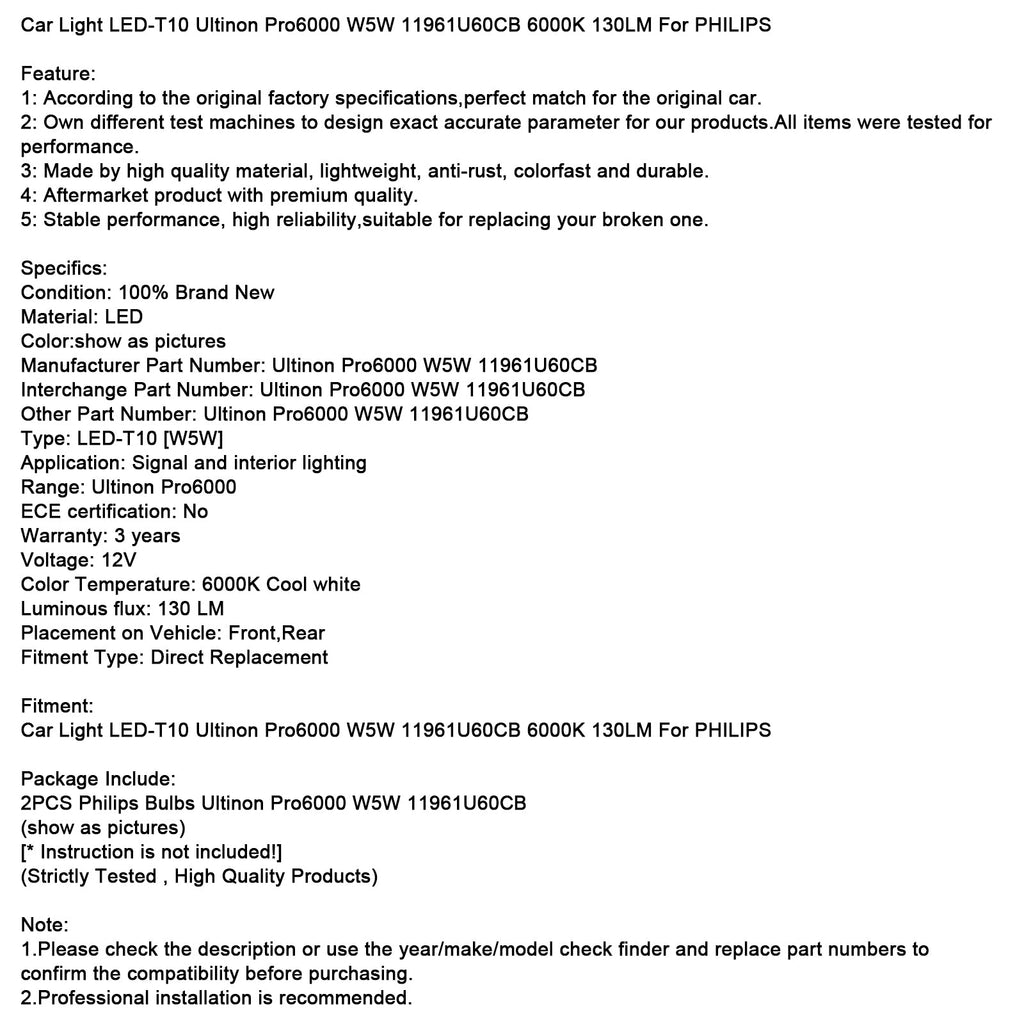 Faro LED para coche T10 Ultinon Pro6000 W5W 11961U60CB 6000K 130LM para PHILIPS