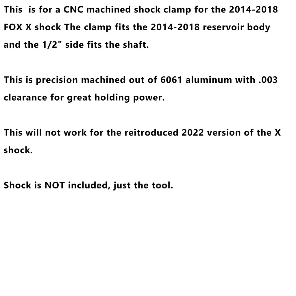 Esta es una abrazadera de amortiguador mecanizada por CNC para el amortiguador FOX X 2014-2018. La abrazadera se adapta al cuerpo del depósito 2014-2018 y al 1/2"" se adapta al árbol.