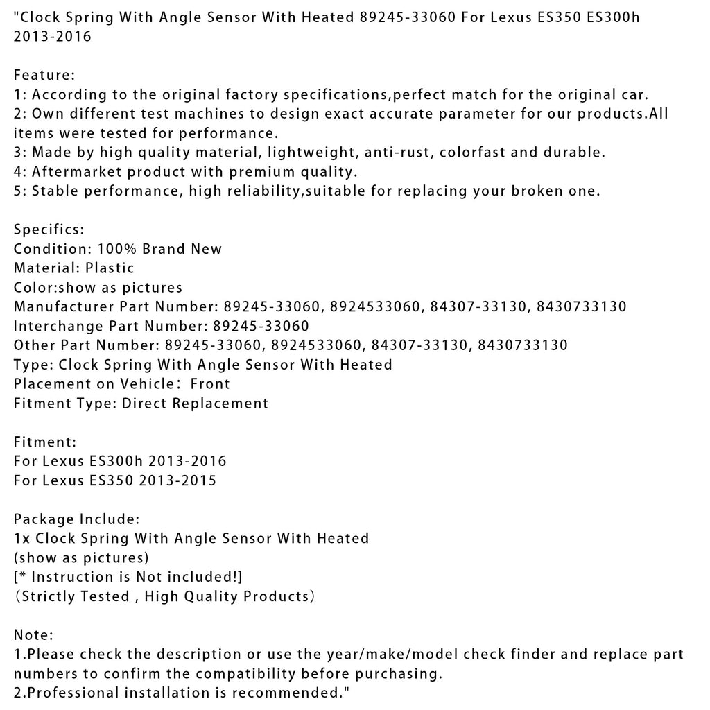 Muelle de retorno con sensor de ángulo calentado 89245-33060 compatible con Lexus ES350 ES300h 2013-2016