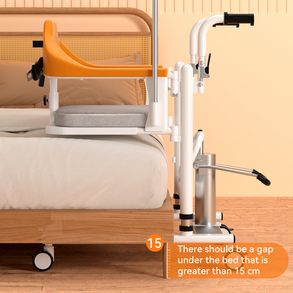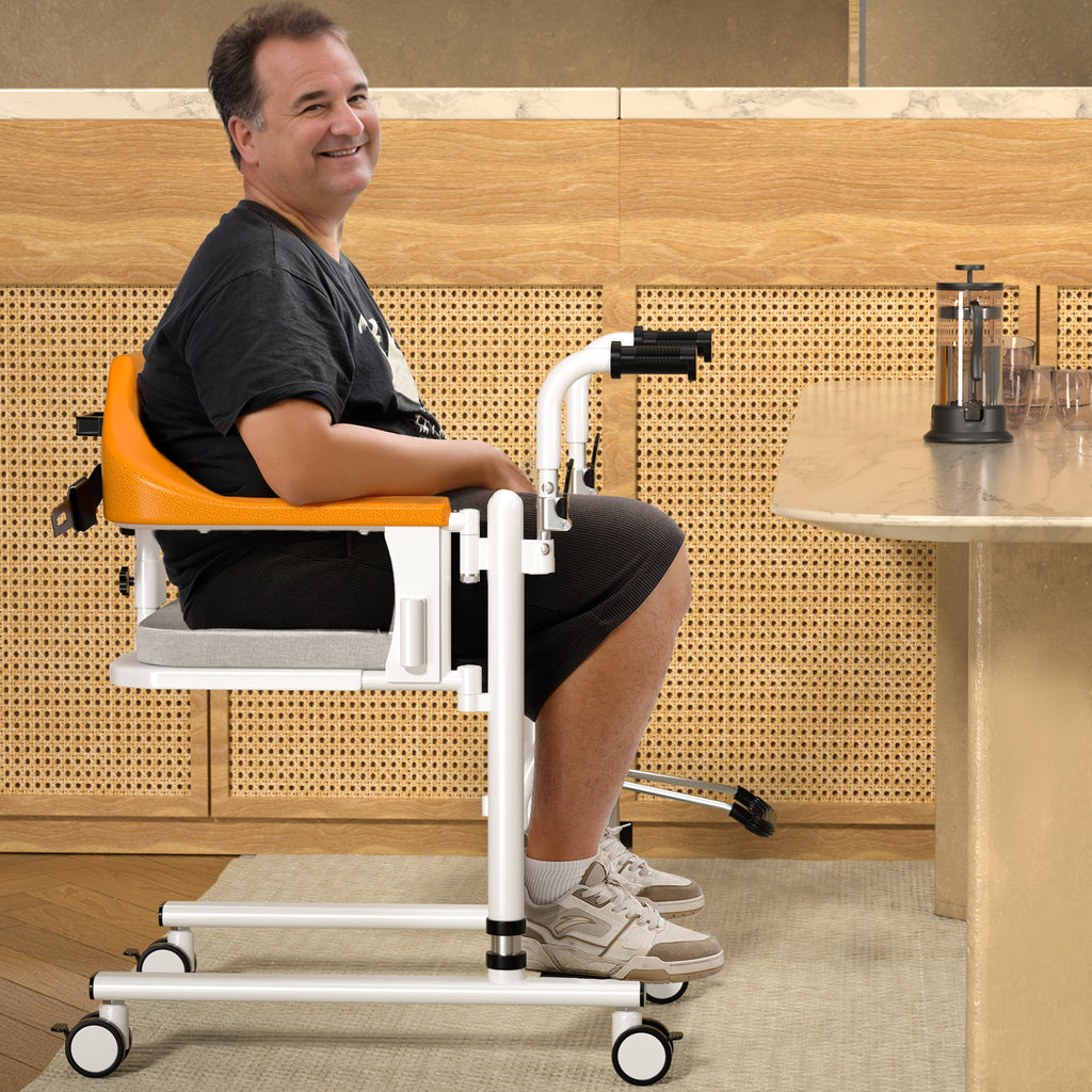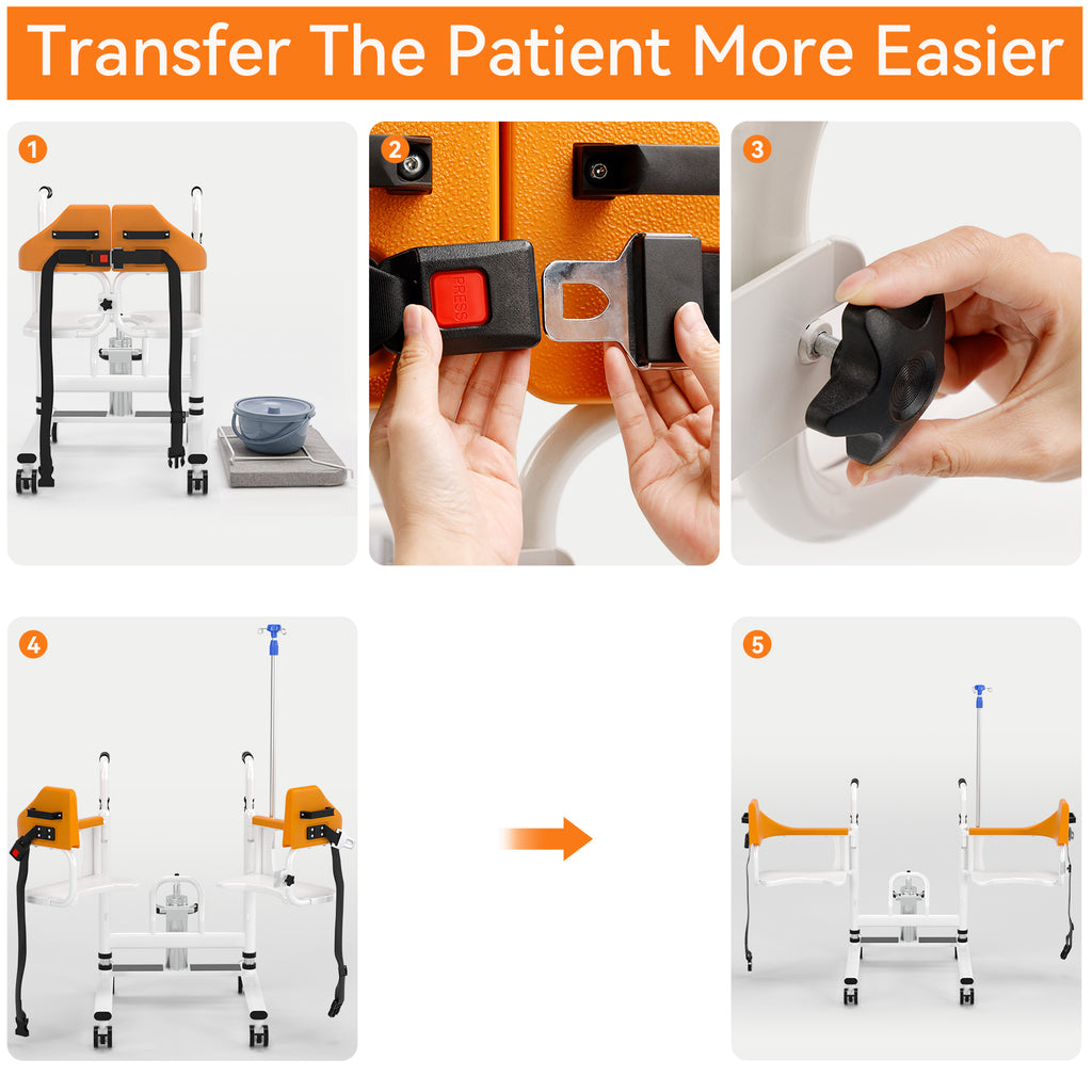 Esta silla de ruedas elevadora es un dispositivo revolucionario diseñado para proporcionar una forma cómoda y segura de transportar a pacientes con movilidad limitada dentro de sus hogares o centros de atención. Es muy versátil y duradero, cómodo para el paciente y fácil de usar para los cuidadores. La instalación sin herramientas, el marco liviano y la portabilidad lo convierten en una opción ideal para el cuidado en el hogar. El elevador de traslado de pacientes proporciona mayor comodidad a la hora de trasladarse a diferentes partes de su hogar o instalación. Con este elevador de pacientes, usted podrá pasar más tiempo en su sala de estar con su familia sin preocuparse por moverse. Evite las comidas antes de acostarse y vuelva a disfrutar de su antigua rutina comiendo en el comedor con amigos y familiares. El elevador está equipado con cerraduras dobles delanteras y traseras que garantizan la seguridad y evitan accidentes durante el transporte. La altura de la unidad se puede ajustar para adaptarse a las diferencias de altura durante el transporte. El asiento del dispositivo se pliega 90° para ayudarle a moverse de forma segura desde una posición sentada a una silla. También incluye mangos ergonómicos que proporcionan un agarre cómodo y seguro para usted o su cuidador. Además, ofrece un recorte en el asiento para uso en el inodoro y se puede acoplar un balde de inodoro portátil para mayor comodidad. Diseñado para restaurar la capacidad de una persona de moverse en su casa o cualquier instalación, hace la vida más fácil para todos los involucrados. Recupere su libertad y muévase sin esfuerzo de una habitación a otra con este innovador dispositivo.