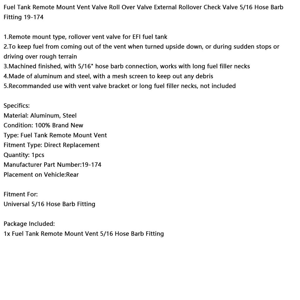 Válvula de ventilación de montaje remoto del tanque de combustible, válvula de vuelco, válvula de retención externa, conexión de púas de manguera de 5/16"" 19-174