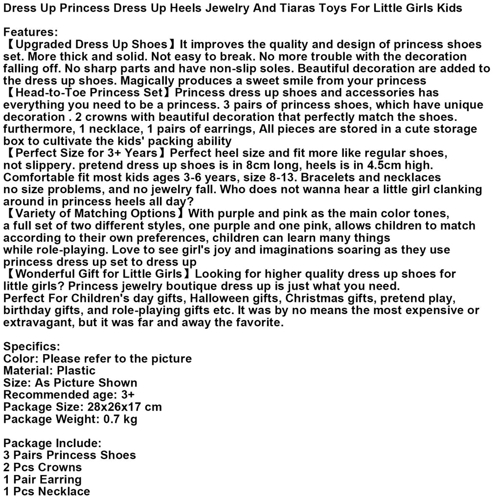 【Juego de princesa de pies a cabeza】Los zapatos y accesorios de princesa tienen todo lo que necesitas para ser una princesa. 3 pares de zapatos de princesa, que tienen una decoración única. 2 coronas con bonita decoración que combinan perfectamente con los zapatos. Además, 1 collar, 1 par de aretes, todas las piezas se guardan en una hermosa caja de almacenamiento para cultivar la capacidad de envolver de los niños.