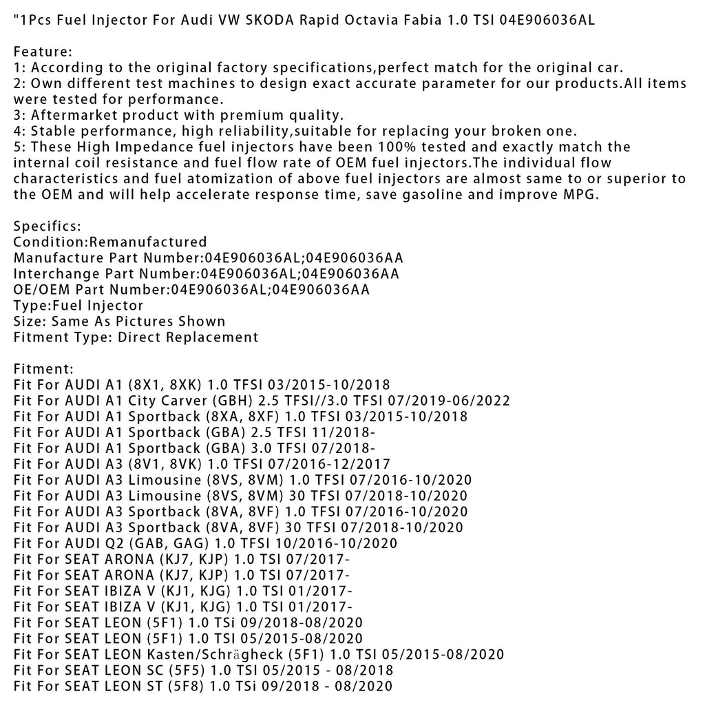 1 polttoaineen suutin Audi VW SKODA Rapid Octavia Fabia 1.0 TSI 04E906036AL:lle