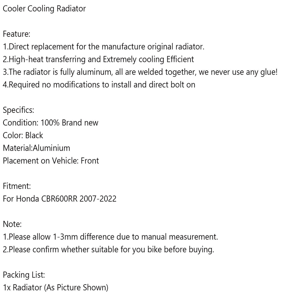 Alumiininen jäähdyttimen jäähdytys Honda F5 CBR600RR CBR 600RR 2007-2022:lle