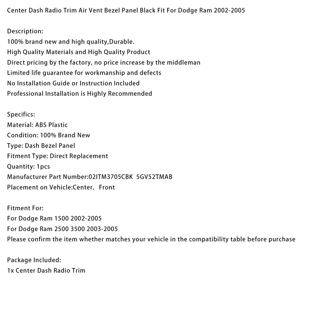 Autoradion keskiosan kojelaudan suojus, musta tuuletuspaneeli, yhteensopiva Dodge Ram 2002-2005 -mallien kanssa