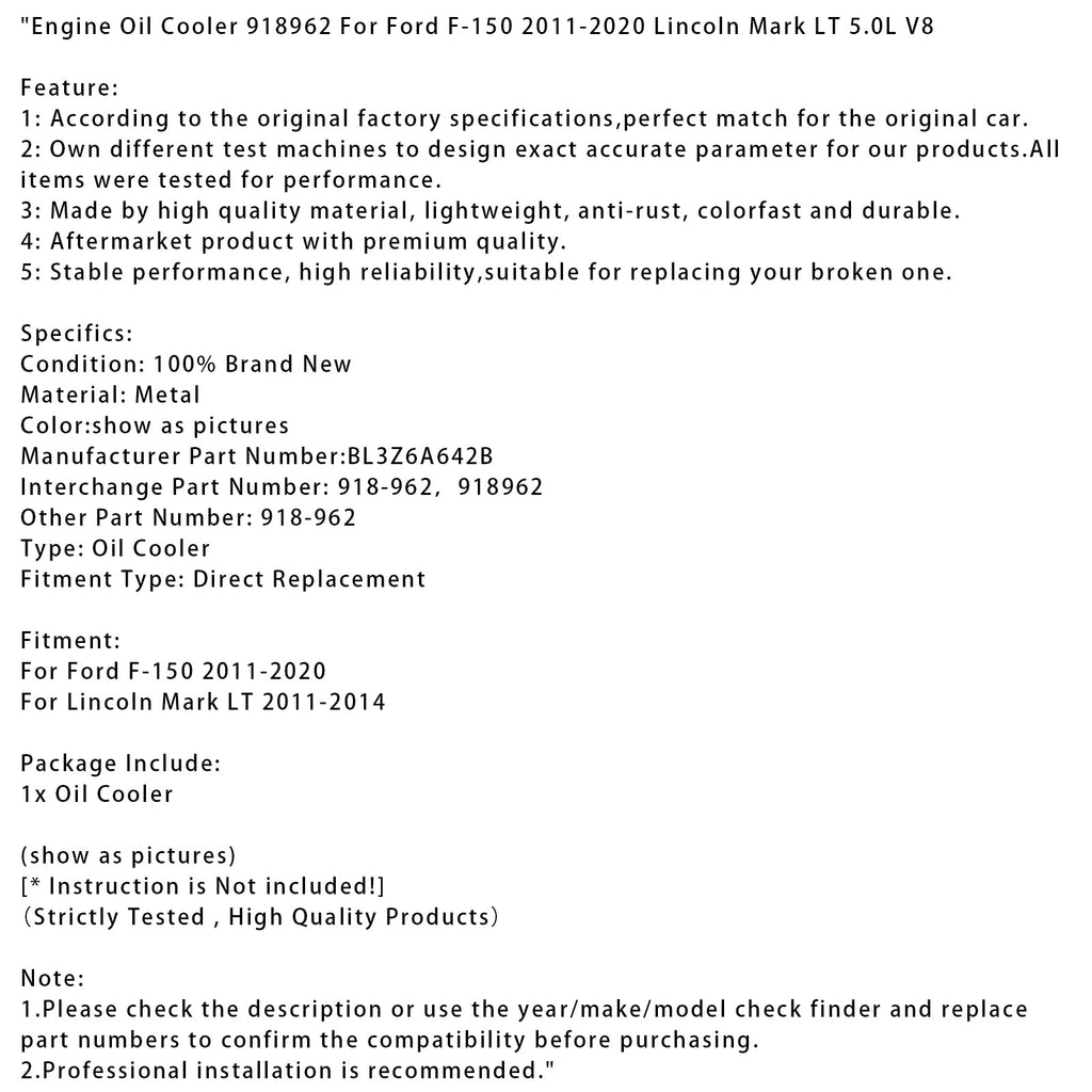 Moottoriöljyn jäähdytin 918962 yhteensopiva Ford F-150 2011-2020 ja Lincoln Mark LT 5.0L V8 kanssa
