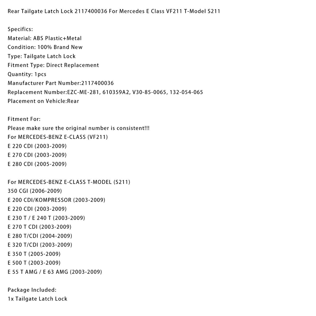 Takaluukun lukko 2117400036 yhteensopiva Mercedes E-sarjan VF211 ja T-mallin S211 kanssa