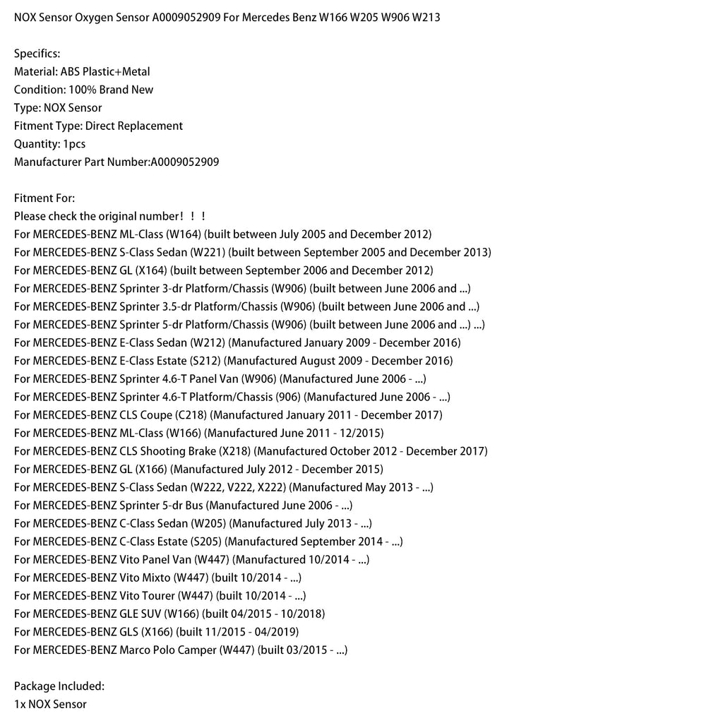 Capteur NOX, capteur d'oxygène A0009052909 compatible avec Mercedes-Benz W166, W205, W906 et W213
