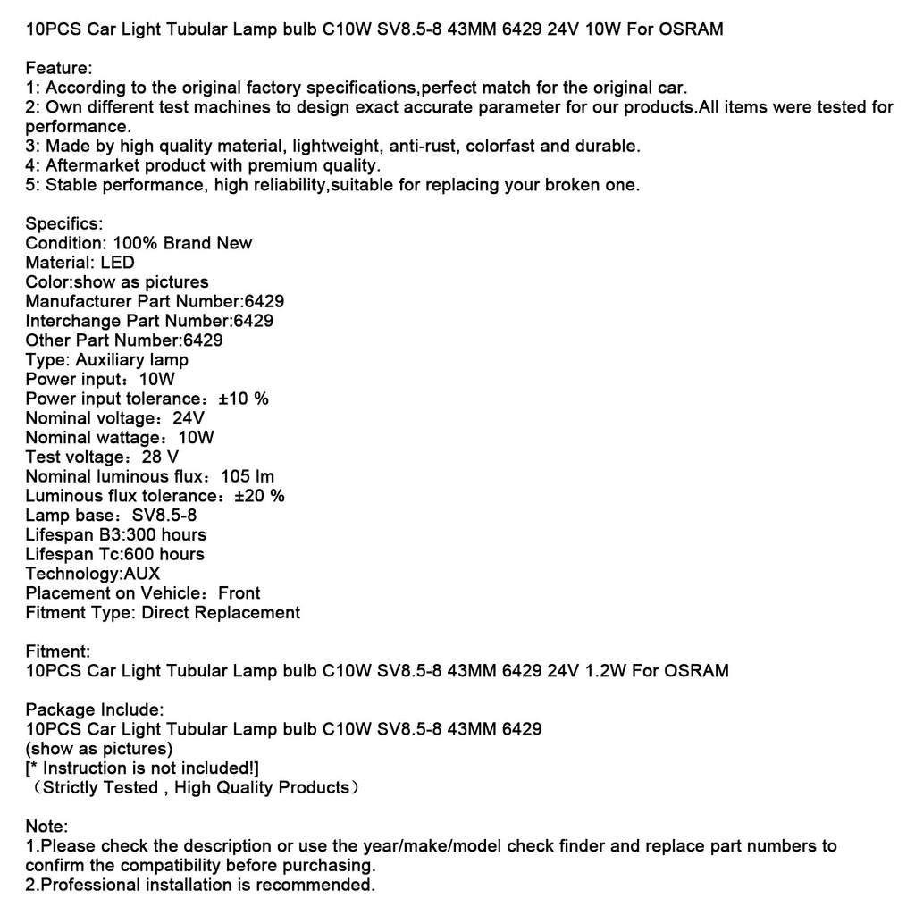 Lot de 10 ampoules tubulaires pour éclairage de voiture C10W SV8.5-8 43 mm 6429 24 V 1,2 W pour OSRAM