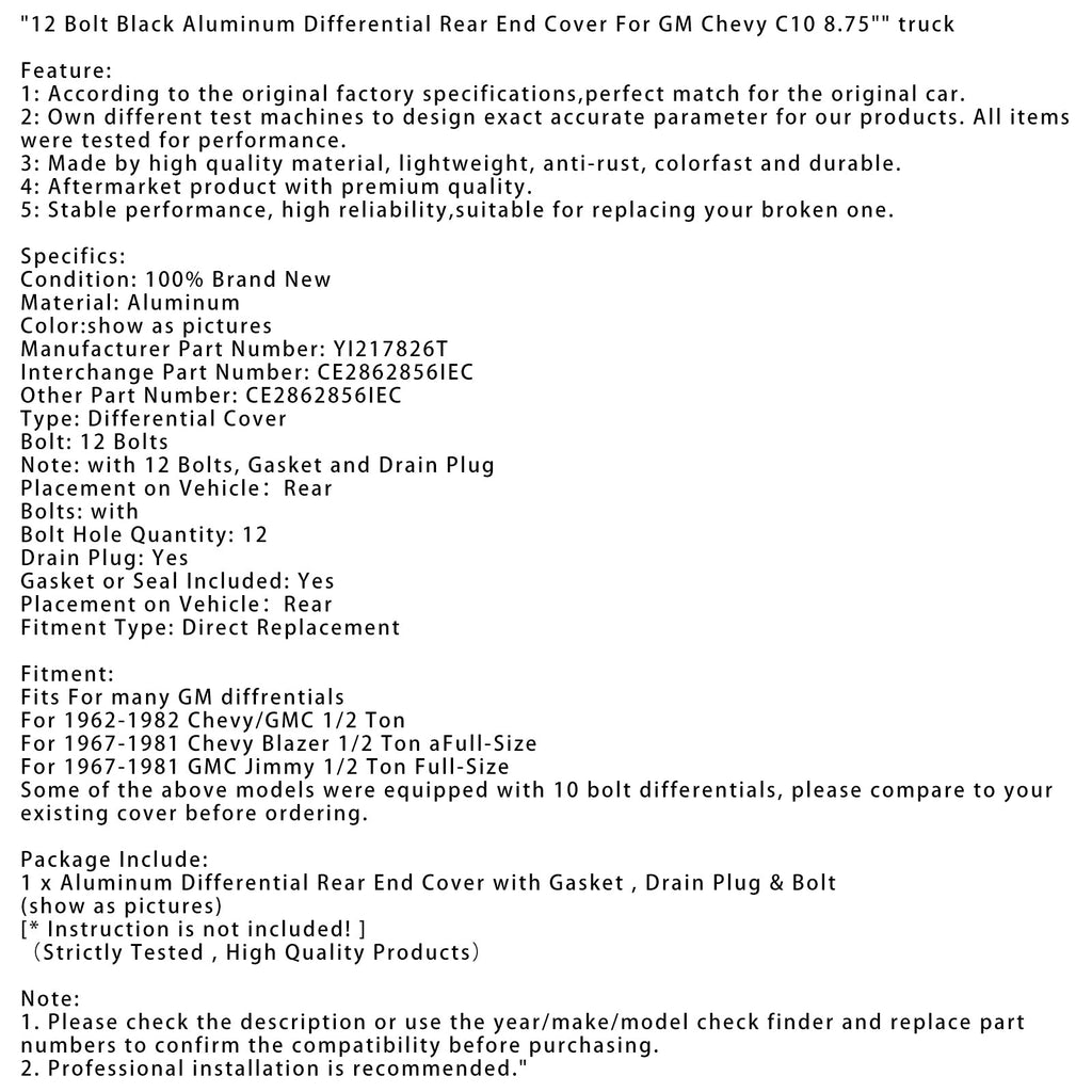 1967-1981 Chevy Blazer 1/2 tonne aFull-Size 12 boulons couvercle d'extrémité arrière différentiel en aluminium noir YI217826T CE2862856IEC