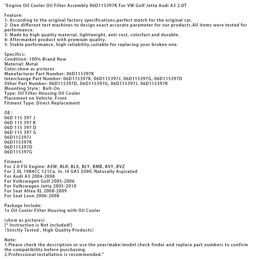 Filtre à huile pour refroidisseur d'huile moteur 06D115397K pour VW Golf Jetta Audi A3 2.0T