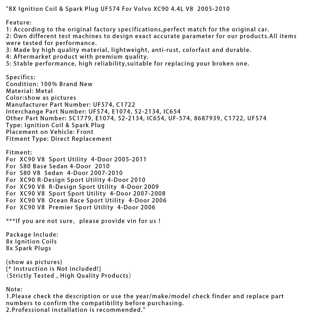 Bobine d'allumage et bougie d'allumage 8X UF574 compatibles avec Volvo XC90 4.4L V8 2005-2010