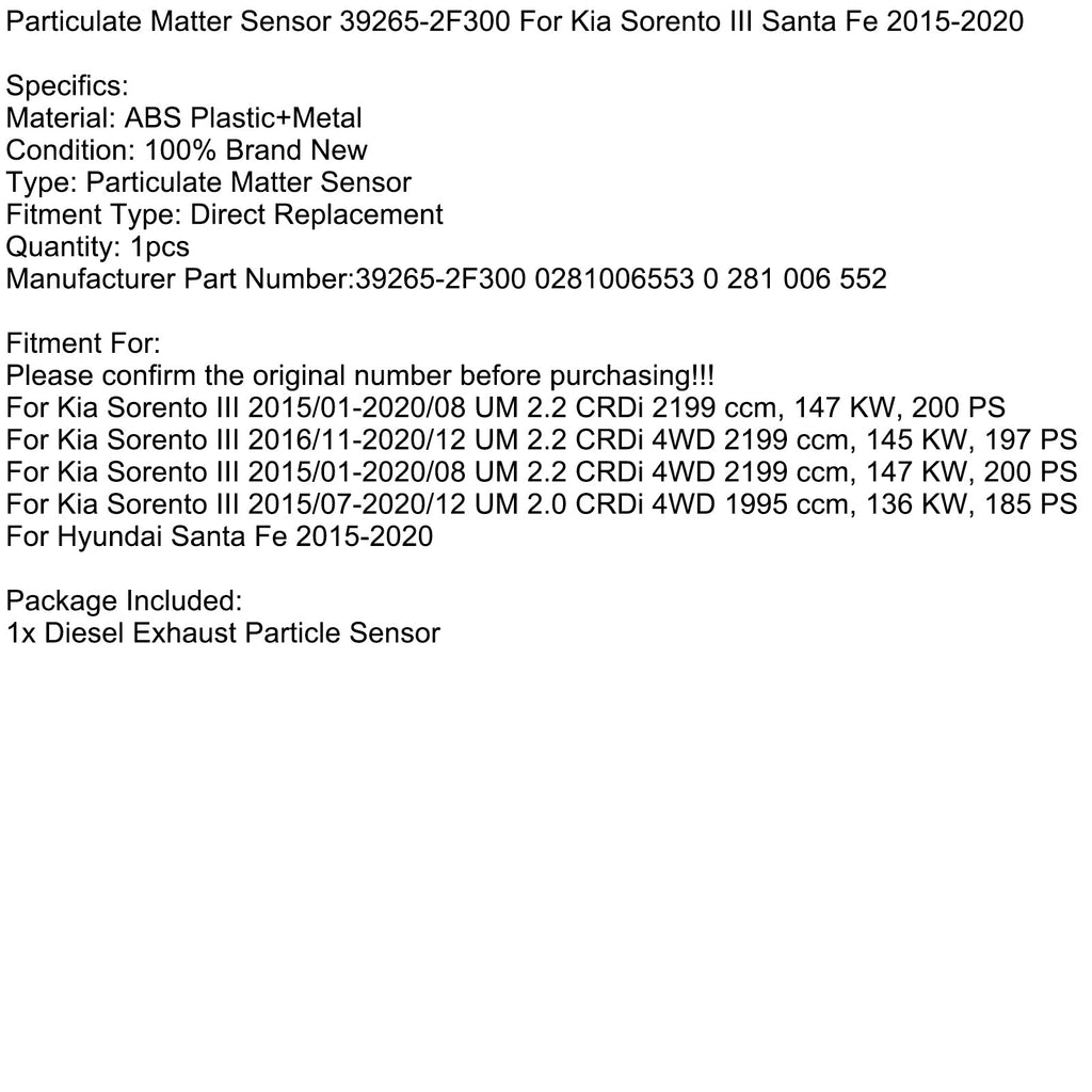 Capteur de particules 39265-2F300 adapté pour Kia Sorento III Santa Fe 2015-2020