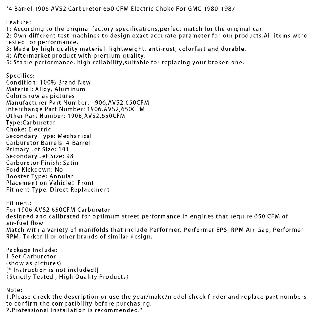 Carburateur AVS2 4 corps 1906 650 pi3/min, starter électrique pour GMC 1980-1987