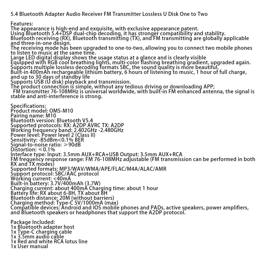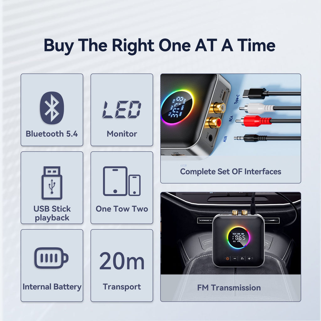 Adaptateur Bluetooth 5.4, récepteur Audio, transmetteur FM, disque U sans perte, un à deux