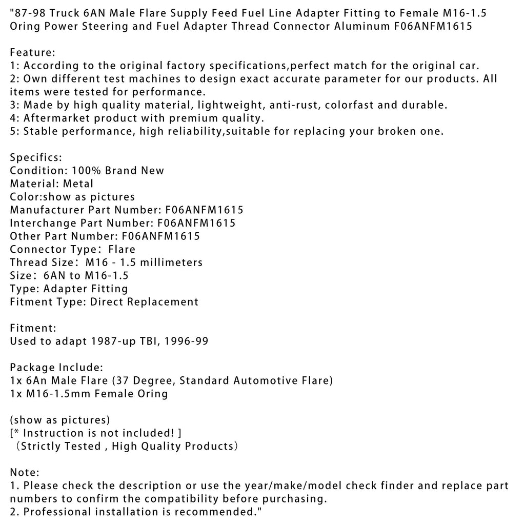 Adaptateur de conduite de carburant mâle évasé 6AN pour camion 87-98, raccord fileté M16-1,5 femelle pour direction assistée et adaptateur de carburant, aluminium F06ANFM1615