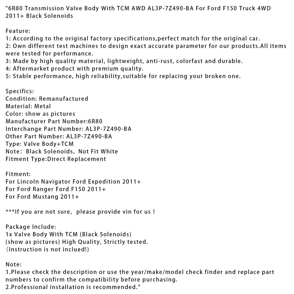 Corps de soupape de transmission 6R80 avec solénoïdes noirs TCM AWD AL3P-7Z490-BA pour camion Ford F150 4WD 2011+