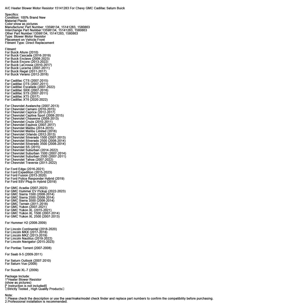 Résistance de moteur de ventilateur de chauffage de climatisation 15141283 pour Chevrolet GMC Cadillac Saturn Buick