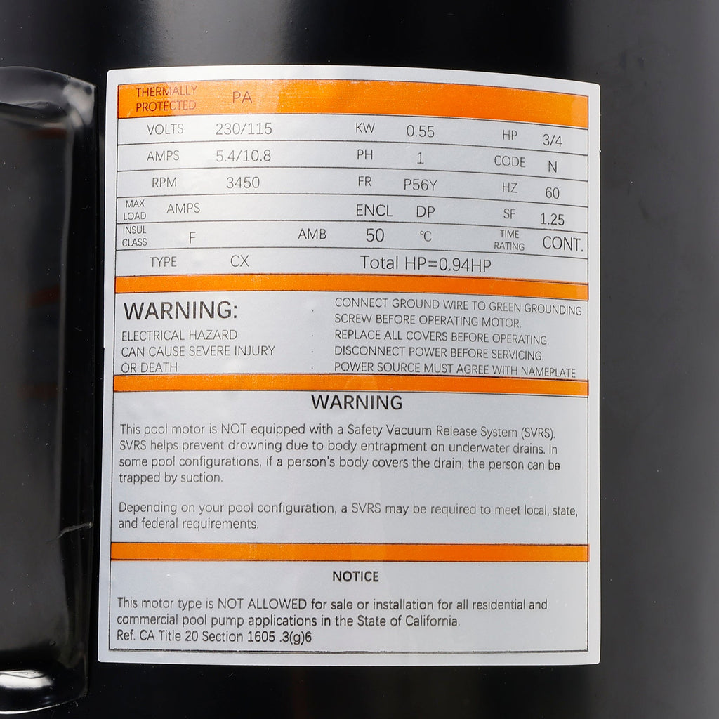 Pour moteur de pompe de piscine à vitesse unique B2852 Up-Rate 3/4 HP 3450 tr/min