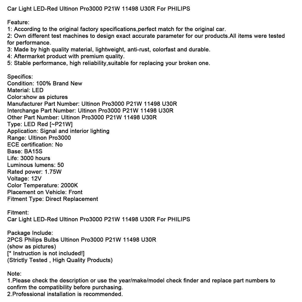 Phare LED rouge Ultinon Pro3000 P21W 11498 U30R pour voiture Philips