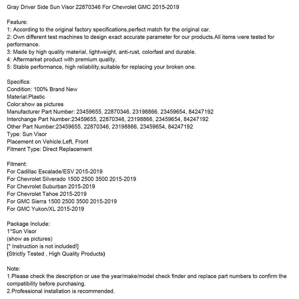 Pare-soleil gris côté conducteur 22870346 pour Chevrolet GMC 2015-2019
