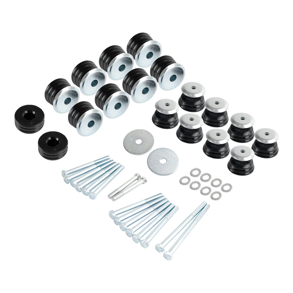 Les supports de bague de corps sont conçus avec précision pour remplacer directement les supports d'usine usés ou défectueux. L'ensemble complet remplace toutes les bagues, manchons et matériels de corps OEM. Les bagues sont un mélange de polyuréthane de qualité supérieure qui isole la cabine tout en conservant une durabilité supérieure.