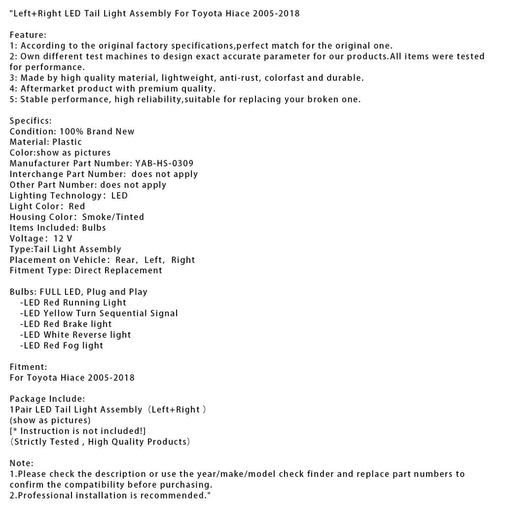 Ensemble de feux arrière à LED gauche et droit pour Toyota Hiace 2005-2018