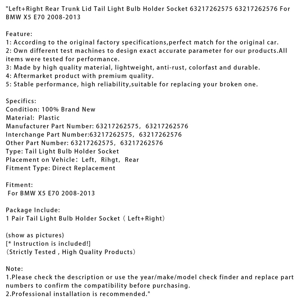 Douille de support d'ampoule de feu arrière gauche et droit pour couvercle de coffre arrière 63217262575 63217262576 pour BMW X5 E70 2008-2013