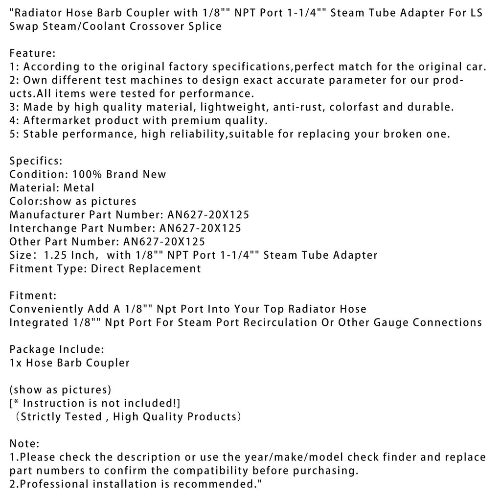 Raccord cannelé pour tuyau de radiateur avec orifice NPT 1/8"" et adaptateur de tube vapeur 1-1/4"" pour raccord croisé vapeur/liquide de refroidissement LS Swap