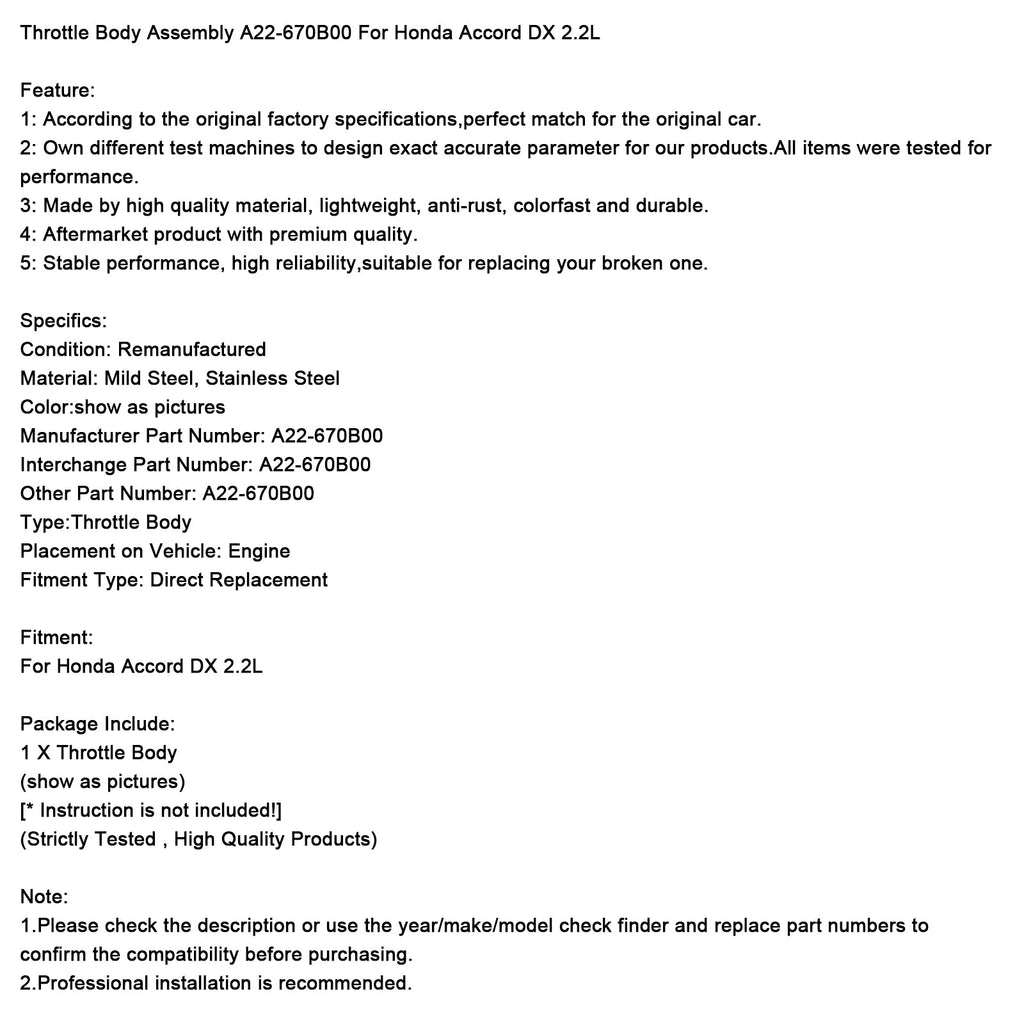 Ensemble de corps de papillon A22-670B00 pour Honda Accord DX 2.2L