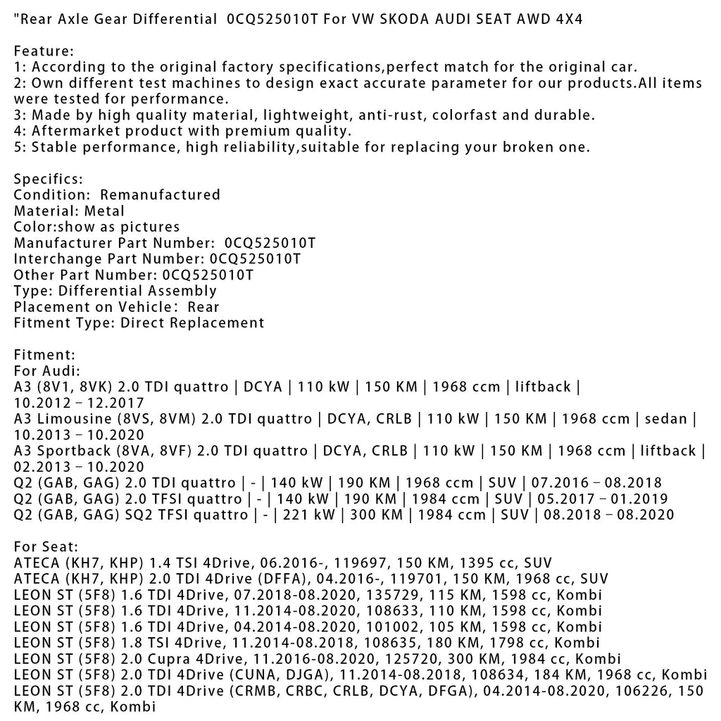 Differenziale assale posteriore 0CQ525010T per VW SKODA AUDI SEAT AWD 4X4