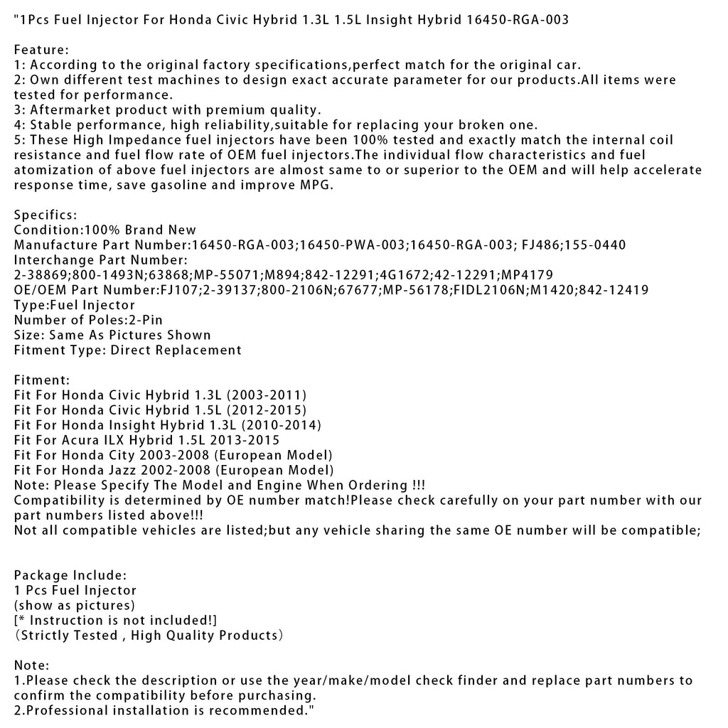 1 iniettore di carburante per Honda Civic Hybrid 1.3L 1.5L Insight Hybrid 16450-RGA-003