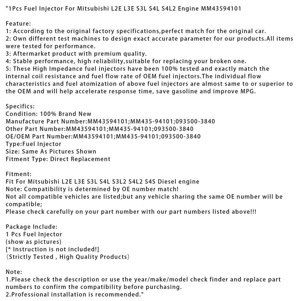 1 iniettore di carburante per motore Mitsubishi L2E L3E S3L S4L S4L2 MM43594101