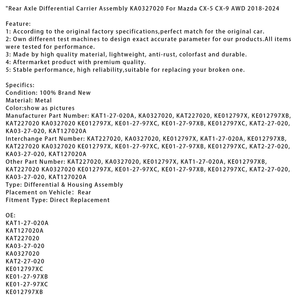 KA0327020 Gruppo supporto differenziale assale posteriore compatibile con Mazda CX-5 CX-9 AWD 2018-2024