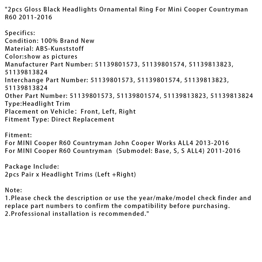 Set di 2 anelli di finitura per fari anteriori neri lucidi per Mini Cooper Countryman R60 2011-2016