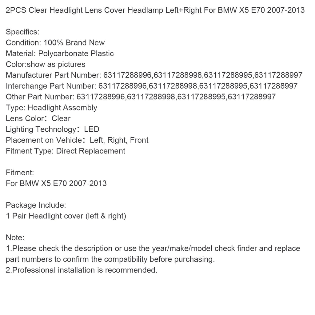 Set di 2 coperture trasparenti per fari anteriori sinistro e destro per BMW X5 E70 2007-2013