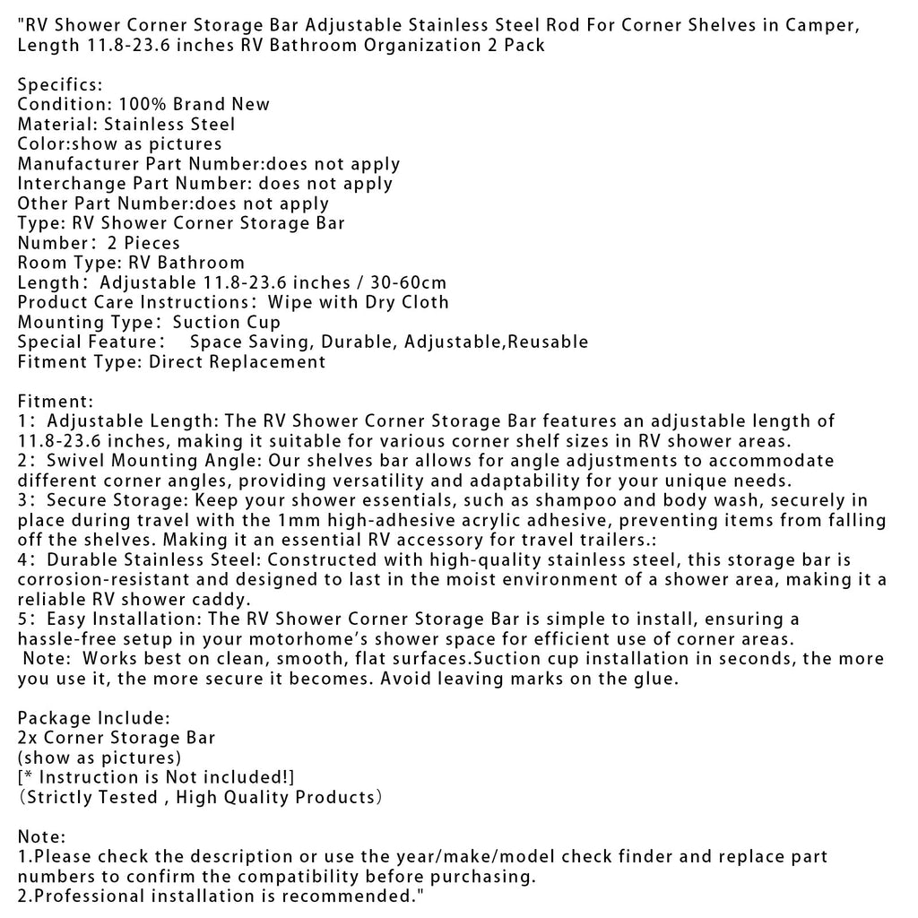 1: Lunghezza regolabile: la barra portaoggetti angolare per doccia del camper è dotata di una lunghezza regolabile da 11,8 a 23,6 pollici, rendendola adatta a ripiani angolari di diverse dimensioni nelle aree doccia del camper.