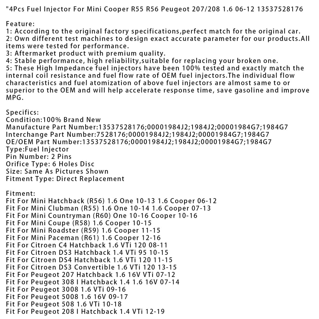 4 iniettori carburante per Mini Cooper R55 R56 Peugeot 207/208 1.6 06-12 13537528176